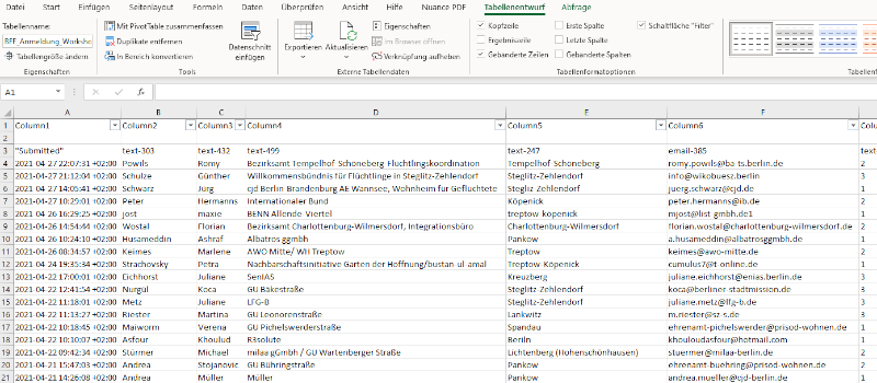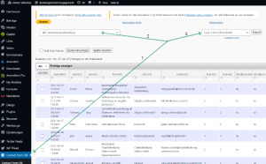 Die Anmeldungen werden in der Contact Form DB unter diesem (1) Menuepunkt im Dashboard gespeichert. Die gewünschte Datei hier (2) auswählen und im CSV-Format Excel CSV (UTF8-BOM) (3) herunterladen und auf dem eigenen PC unter Downloads speichern. Der früher vorgeschlagene Export der Wahl nach dem TSV-Format funktioniert offenbar nicht immer. Darum den hier beschriebenen Weg wählen, bitte. Es gibt auch andere Wege. Dieser ist erprobt.